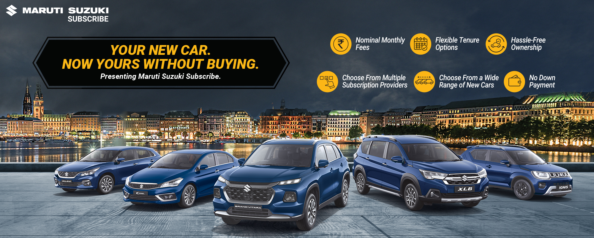 Maruti Suzuki Subscribe enables all customers to enjoy driving their preferred Maruti Suzuki cars without having to deal with all the financial responsibilities that come with owning a car.All you need to do is opt for a monthly subscription plan at a fixed monthly fee, which includes the routine maintenance and insurance costs, and choose a flexible tenure. At Mandovi Motors Pvt Ltd in, , Mysore, all Hatchback, Sedan, SUV, the MUV models line-up includes Baleno, Invicto, EVitara, Jimny, Ciaz, Ignis, Fronx, Grand Vitara, XL6. Here, you will enjoy Maruti Suzuki Subscribe benefits such as: